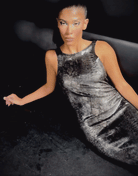 Questo abito slip senza schiena è realizzato in tessuto traslucido con stampa pitone, offrendo una vestibilità elastica e confortevole. La sua lunghezza lunga lo rende adatto a ogni occasione, dal giorno alla sera. È caratterizzato da una spacco posteriore per facilitare il cammino e una scollatura profonda lungo la schiena.